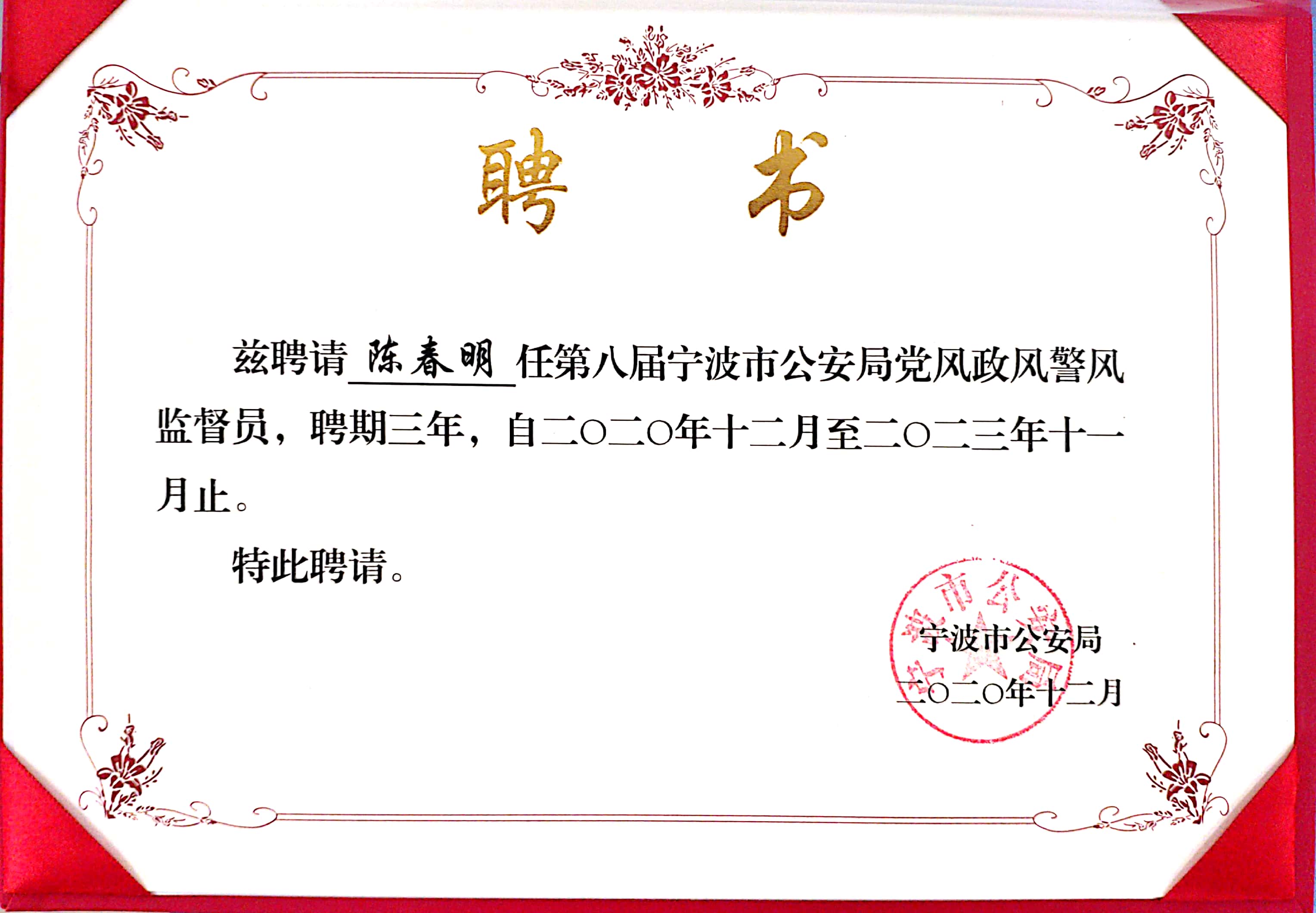 同时经相关单位推荐审核,宁波市公安局聘任来自社会各界的35人为新一届党风政风警风监督员,集团董事长陈春明位列其中并接受了聘书。